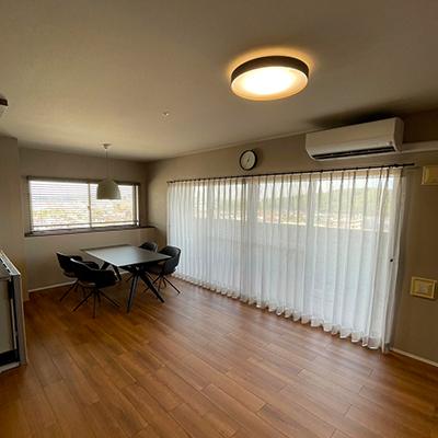 開口の広い掃き出し窓には、ブラウンがかったレースカーテンを採用。