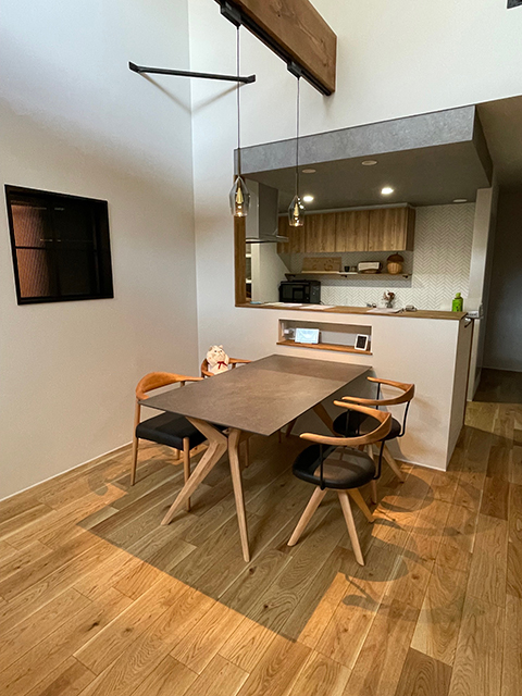 今回お選びいただいたダイニングテーブルは、落ち着いたダークグレーのセラミック天板に、ナチュラル色の木脚を組み合わせたモデル。キッチンや床材との相性も良く、モダンで上品な印象に仕上がっています。